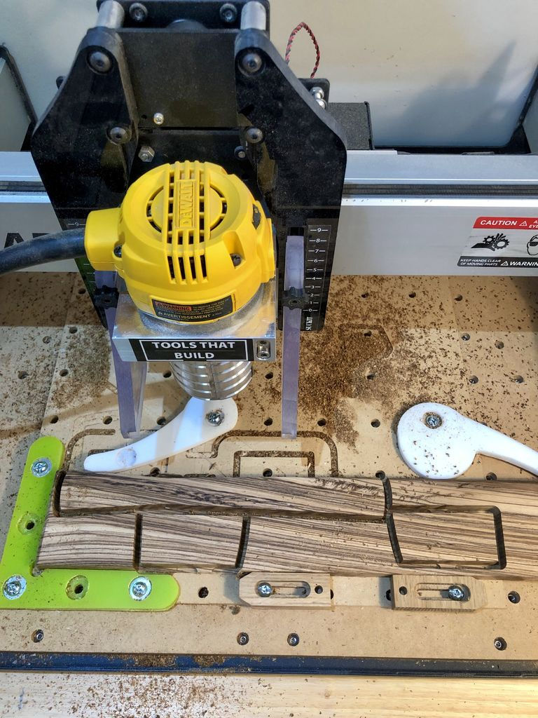 This project can be cut completely on the CNC. I use a 1/4" down cut bit for the entire project. It is important when squaring up the already cut down material on the machine that the grain is running vertically down the mallet handle and ideally will have end grain on the striking sides. This will give both the head and handle strength.