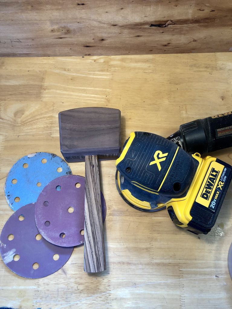 Finally, sand the entire mallet. Maintain the shape of the mallet and evenly sand all surfaces smooth. This is the time to remove any imperfections and alignment issues from the glue up stage. Using the sander, I round the handle on the edges to make a more comfortable grip. I sand the entire mallet starting with 80 grit and work through 150, 180 and 220 grit sandpaper.