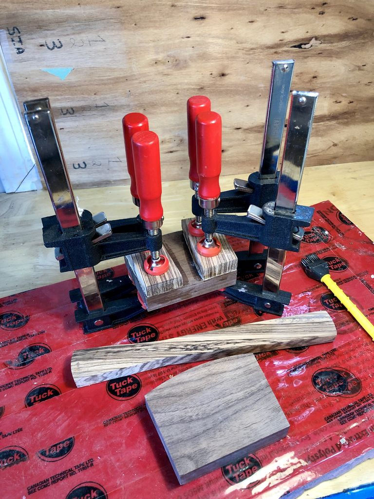 First, glue the handle and the two inside pieces (the Zebra wood) to one of the mallet head outside pieces (the Walnut). Make sure you check the fit of your handle as you set up the glue. The handle should stick out the top slightly. Using clamps, apply even pressure across the wood and allow to dry. Once the glue is dry on the first part, remove any excess glue and glue on the final outside piece of the mallet head.