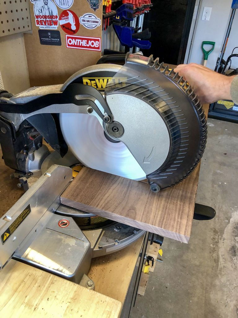 For this project, my next step is breaking down the two different woods into usable pieces with minimal waste. I cut a long board into more easily manageable pieces at the miter saw station. The Zebra wood is cut into a 4" X 15" piece which is the minimum size and will be just big enough to cut the handle and two inside layer pieces. The Walnut will be cut down into a 6" x 12" piece - big enough for the larger two outside pieces of the mallet with a little extra left over. Using a CNC makes this process easier since you don't need to worry about exact thickness or clean edges at this point.