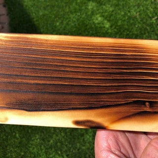 Once the wood is all evenly burnt you can begin to add the char to it. There is different degrees of burnt but it is all preference on final look. At this step its normal if the wood crackles or pops as you burn it. Edges will burn faster than the front and back. You want to make sure all sides of the wood have an even deep char.